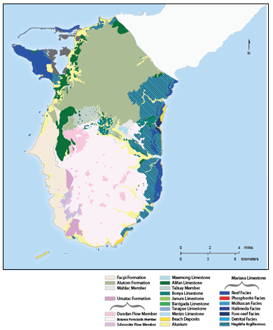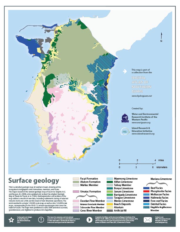 Southern Guam geospatial information serverSurface geology![]() About this map:This is a detailed geologic map of southern Guam, showing all the recognized stratigraphic units: formations, members, and facies. The map is based on the newest geologic map of Guam by Siegrist, H.G. and Reagan, M. (2008), who updated and revised the original Geologic Map of Guam by Tracey et al. (1964). Reinterpretation and revision of the map utilized a wealth of new data, including radiometric dating of selected volcanic rocks and a thin-section study of new limestone specimens. The work resulted in a single 1:50,000-scale map, as well as nine 1:24,000 scale maps, corresponding to the USGS 7.5-minute quadrangles that cover the island of Guam. The maps were published in early 2008 and were scanned, georeferenced, and digitized to produce GIS shapefiles. |