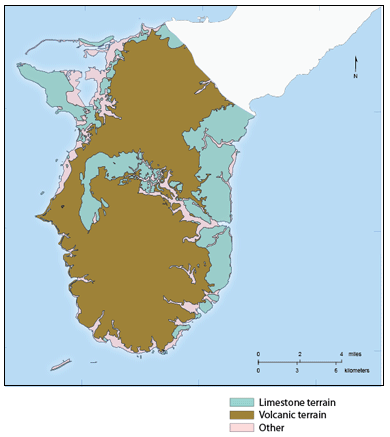 This simple geologic map of southern Guam indicates the distribution of fundamental terrain types. The map is based on the newest geologic map of Guam by Siegrist, H.G. and Reagan, M. (2008), who reinterpreted and revised the Geologic Map of Guam by Tracey et al. (1964).