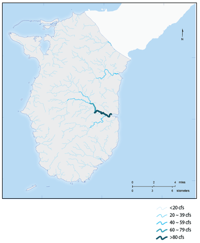 Southern Guam geospatial information serverStreamflow (Average streamflow modeled by GIS)![]() About this map:This map shows the average streamflow (in cubic feet per second) of streams and rivers in southern Guam. The geospatial data were derived by means of GIS spatial analysis techniques using a digital elevation model and average annual rainfall as part of a recent study by the Water and Environmental Research Institute of the Western Pacific (WERI) to predict flow duration curves at ungaged sites. The raw data package for download also includes the average rainfall upstream for stream segments and the drainage area upstream for stream segment. Please note that the exact location and number of streams may differ from other hydrologic data in this atlas as a different model and input datasets were used to derive these datasets. For more information, see the appropriate WERI Technical Report (L.F. Heitz and S. Khosrowpanah, 2015). |