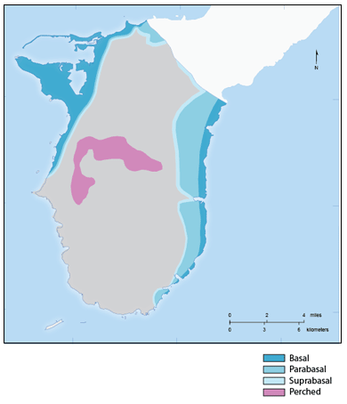 This map shows the extent of significant groundwater zones in southern Guam. Only groundwater in limestone and alluvial units is shown because groundwater in volcanic units is not easily extracted due to the rocks' low porosity and permeability. The dataset was derived from the surface geology dataset by generally classifying all non-volcanic areas as either perched (if groundwater bodies sit at elevations above sea level and have no direct connection to the ocean) or basal/parabasal (if connected to the ocean and underlain by seawater or volcanic basement units). This dataset was created by Island Research & Education Initiative for the purposes of this atlas.