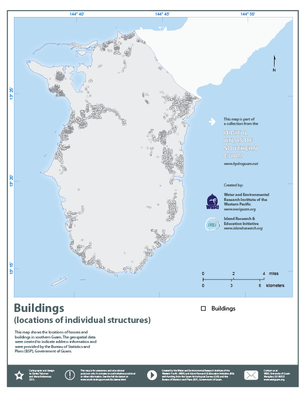 Southern Guam geospatial information serverBuildings (locations of individual structures)![]() About this map:This map shows the locations of houses and buildings in southern Guam. The geospatial data were created to indicate address information and were provided by the Bureau of Statistics and Plans (BSP), Government of Guam. |