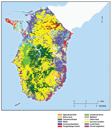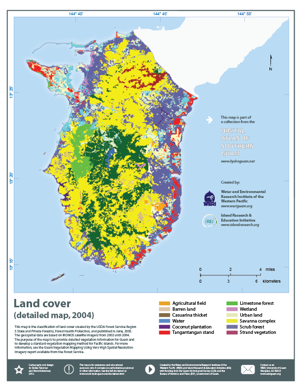 Southern Guam geospatial information serverLand cover (detailed map, 2004)![]() About this map:This map is the classification of land cover created by the USDA Forest Service Region 5 State and Private Forestry, Forest Health Protection, and published in June, 2005. The geospatial data are based on IKONOS satellite imagery from 2002 until 2004. The purpose of the map is to provide detailed vegetation information for Guam and to develop a standard vegetation mapping method for Pacific islands. For more information, see the Guam Vegetation Mapping Using Very High Spatial Resolution Imagery report available from the Forest Service. |