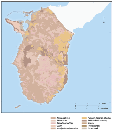 Southern Guam geospatial information serverSoils (by general type)![]() About this map:This is a general map of soils of southern Guam. The source of the geospatial data are the Soil Survey of the Territory of Guam (1985), conducted by the USDA Soil Conservation Service in cooperation with Guam Department of Commerce and University of Guam (UOG). General soil categories on the map are based loosely on the 1985 Simply Soil map by the USDA Soil Conservation Service (now NRCS). This dataset was created by Island Research & Education Initiative for the purposes of this atlas. |