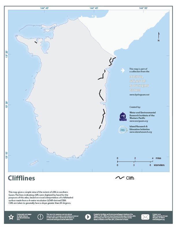 Southern Guam geospatial information serverClifflines![]() About this map:This map gives a simple view of the extent of cliffs in southern Guam. The lines indicating cliffs were digitized by hand for the purposes of this atlas, based on visual interpretation of a hillshaded surface made from a 4-meter resolution LiDAR-derived DEM. Cliffs are taken to generally have a slope greater than 60 degrees. |