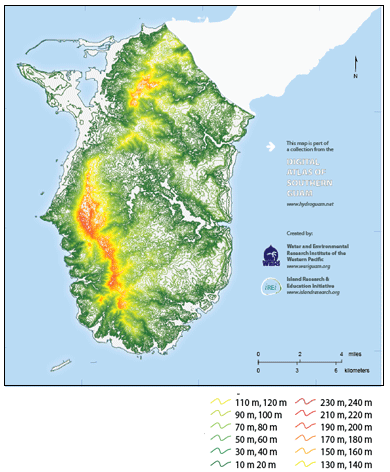 Southern Guam geospatial information server10-m elevation contour lines (color)![]() About this map:This map conveys topography of southern Guam by means of contour lines with 10-meter interval. The contours were created from a 4-meter resolution LiDAR-derived DEM, by means of GIS spatial analysis techniques. LiDAR data were collected in 2007 by JALBTX for the Government of Guam. Since LiDAR does not always extent to the actual shoreline (zero-contour), the shoreline shapefile was added to represent the zero-contour line. Sets of contours are shown in different colors based on the elevation they represent. |