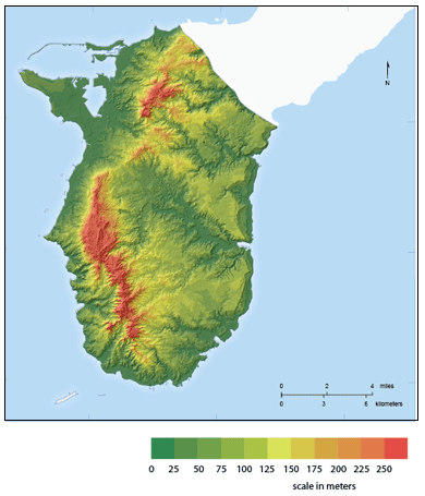 Southern Guam geospatial information serverShaded relief with elevation![]() About this map:This map shows the elevation and relief of terrain in southern Guam. It was created from a 2-meter resolution LiDAR-derived, by means of GIS spatial analysis techniques. LiDAR data were collected in 2007 by JALBTX for the Government of Guam. It consists of two separate layers: DEM classified into elevation intervals and colored and a hillshade (hypsometric tinted shaded relief) layer. This approach creates an illusion of viewing terrain in 3D, while also conveying elevation information. |