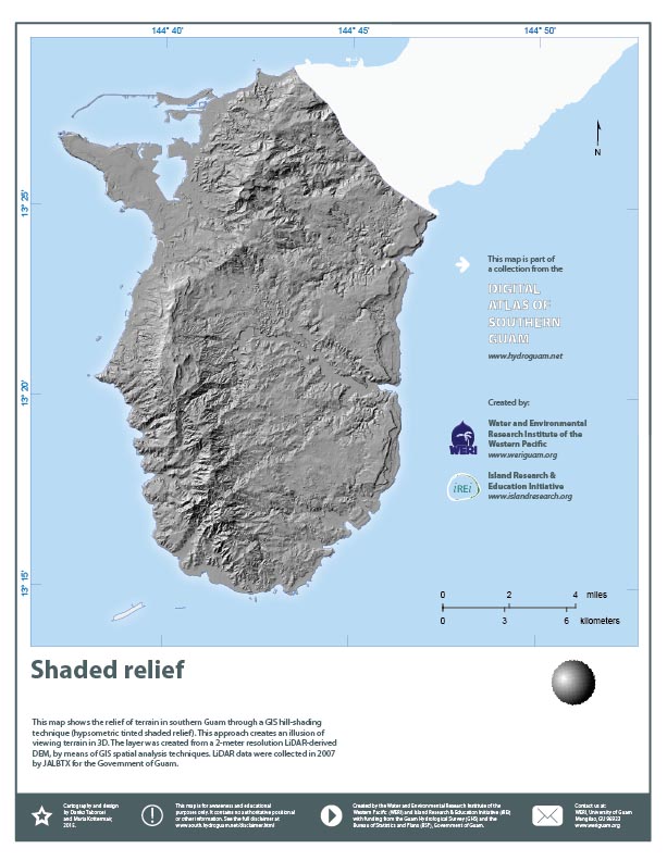 Southern Guam geospatial information serverShaded relief![]() About this map:This map shows the relief of terrain in southern Guam through a GIS hill-shading technique (hypsometric tinted shaded relief). This approach creates an illusion of viewing terrain in 3D. The layer was created from a 2-meter resolution LiDAR-derived DEM, by means of GIS spatial analysis techniques. LiDAR data were collected in 2007 by JALBTX for the Government of Guam. |