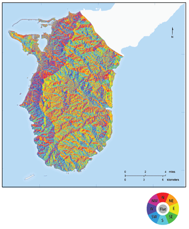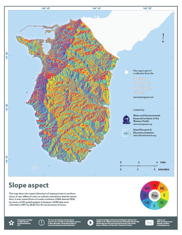 Southern Guam geospatial information serverSlope aspect![]() About this map:This map shows the aspect (direction) of sloping terrain in southern Guam. It uses different colors to indicate orientations that the terrain faces. It was created from a 4-meter resolution LiDAR-derived DEM, by means of GIS spatial analysis techniques. LiDAR data were collected in 2007 by JALBTX for the Government of Guam. |